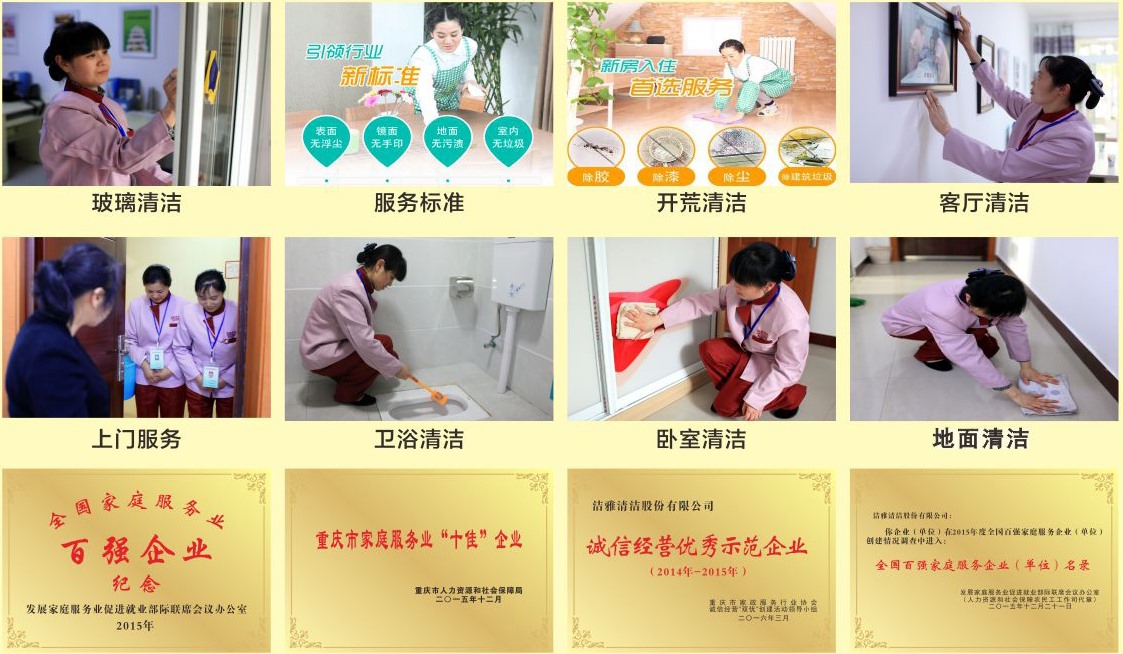 重庆洁雅怡心家政服务有限公司是重庆家政服务行业常务理事单位会员,是全国家庭服务业百强企业,是重庆市家庭服务“十佳”企业,是经重庆市工商行政管理局注册成立的家政服务公司,是一家以互联网形式为市民提供社区服务的家政服务平台。也采用网络智能化管理、员工集中培训,对雇主采用全方位跟踪服务,对雇员进行公司员工制管理,让双方都能认识到“怡心家政”是一家集专业化、规模化、智能化、多元化、个性化于一体的家政公司,向社区提供家庭保洁、计时保姆、钟点服务等专业服务。让客户真正体会到“家政用怡心,家务我省心”的真实含义。 公司拥有一批素质较高且年轻化的家政服务师,她们经过培训,体检合格,具有一技之长才能上岗。她们勤劳肯干,纪律严明,踏实敬业,珍惜公司所提供的就业岗位,维护公司信誉,满足您的要求。同时,公司还将为您们及服务员实行双向保险及保障,对您的财产保险及担保,切实维护服务的合法权益。 我们拥有多层次的服务团队:年轻专业的大学生团队、干练经验丰富的精英团队以及个性化服务的全能型团队。 团队优势: 1、团队年轻化:我们的服务师平均年龄在35岁,他们年轻有活力,具有强烈的家政服务意识,同时他们拥有极强的协作能力。 2、团队知识化:服务师大学学历占20%、高中以及高职学历占65%、初中及以下的占15%。一只知识化的专业团队不管是在服务意识、服务理念、服务态度及服务品质上都能为客户做的更优秀能全面的服务。 3、团队技能化:我们定期和持续的为服务师做多种技能培训,如:家电清洗培训、地毯清理培训、玻璃清洗培训、开荒保洁培训等。团队的技能化能够使团队在服务时能专业、规范、快速、高效施工。 我们为您服务时不是一个家政服务师在为您服务,而是一个专业团队:家政服务师+管家+专家(团队)。家政服务师,是采取一对一的服务;管家,是一对多式服务;专家,是多对多式服务。